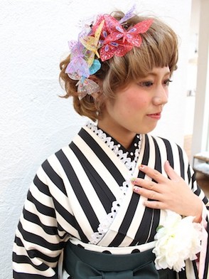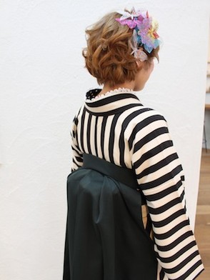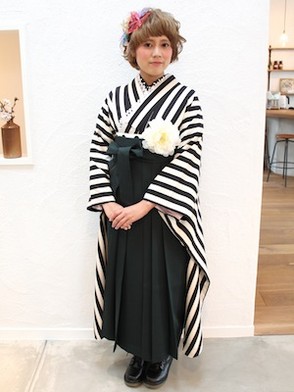 ヘア&着付け*個性的でオリジナリティーあふれるスタイル!!ヘアーは短いマッシュなので、ガーリーに動きをつけて可愛らしさプラス!袴に今年の流行のストライプ柄をチョイスしているのがオシャレです☆